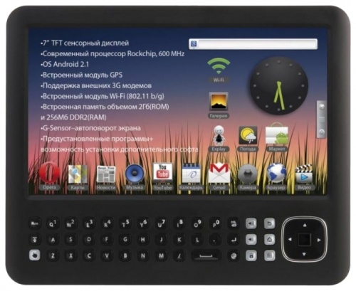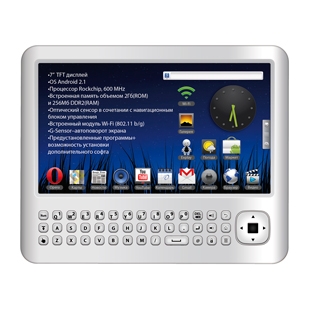 ОС: Android 2.1. Процессор: 600MHz, Rockchip RK2818. Память: встроенная 2Гб . Карты памяти: SD. Вес: 280 г. Размер: 145.8*180*9.9 мм. Батарея: 2100 mA. Экран: TFT. Размер, д.: 7. , Wi-Fi